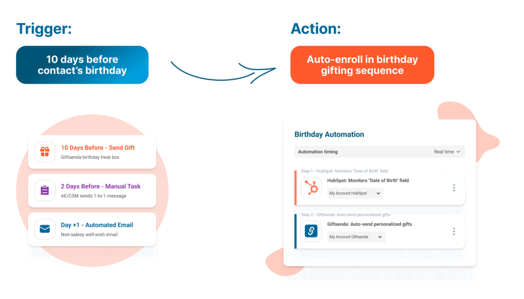 When a contact’s “date of birth” approaches, it’s an ideal opportunity to create a personal touchpoint. Because HubSpot sequences require manual enrollment, the solution is to use a HubSpot workflow that automatically enrolls the contact into a birthday gifting sequence 10 days before their birthday. The lead time ensures that physical gifts can be delivered on schedule, allowing you to delight your contacts with a thoughtful, timely gesture that strengthens relationships and shows you value them personally.