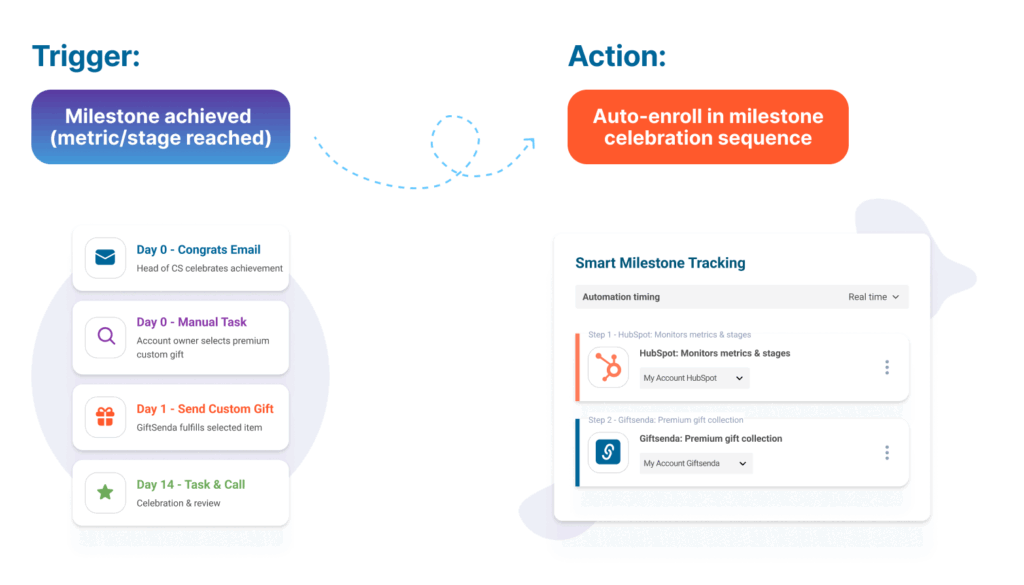 Manual Task (Day 0): A Manual Task is created for the account owner, prompting them to select a premium gift on the GiftSenda platform. For high-tier milestones, you want the human to choose a more thoughtful, relevant item rather than a fully automated default. The task ensures the action is completed.