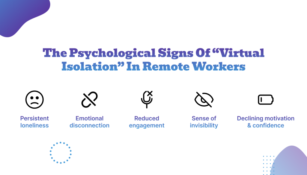 The psychological signs of virtual isolation often appear subtly. Remote workers may experience persistent loneliness, even when attending frequent meetings. A decline in motivation, reduced engagement, or emotional detachment from team goals may also be common. Team members can become less likely to speak up, share ideas, or ask for support, driven by a growing sense of invisibility.
