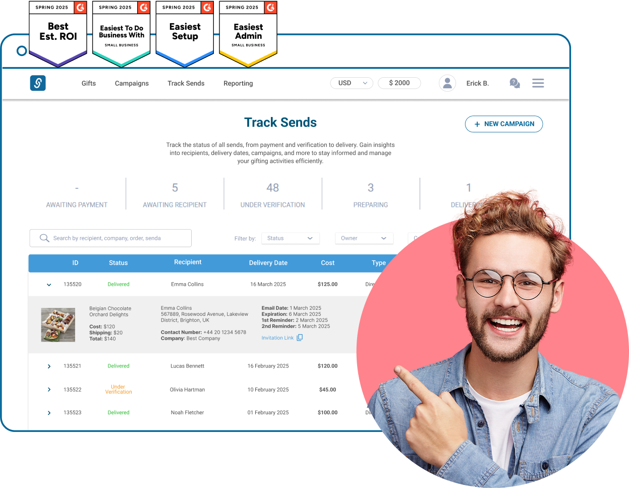 We know that tracking the success of your gift campaigns is critical to optimize your strategy and drive business growth. That’s why our platform offers built-in reporting tools that allow you to see real-time data on the performance of your campaigns. View reports on our dashboard or within your CRM. With Giftsenda, you can track the delivery and status of your gifts, monitor recipient feedback and engagement, and track the ROI of your campaigns.
