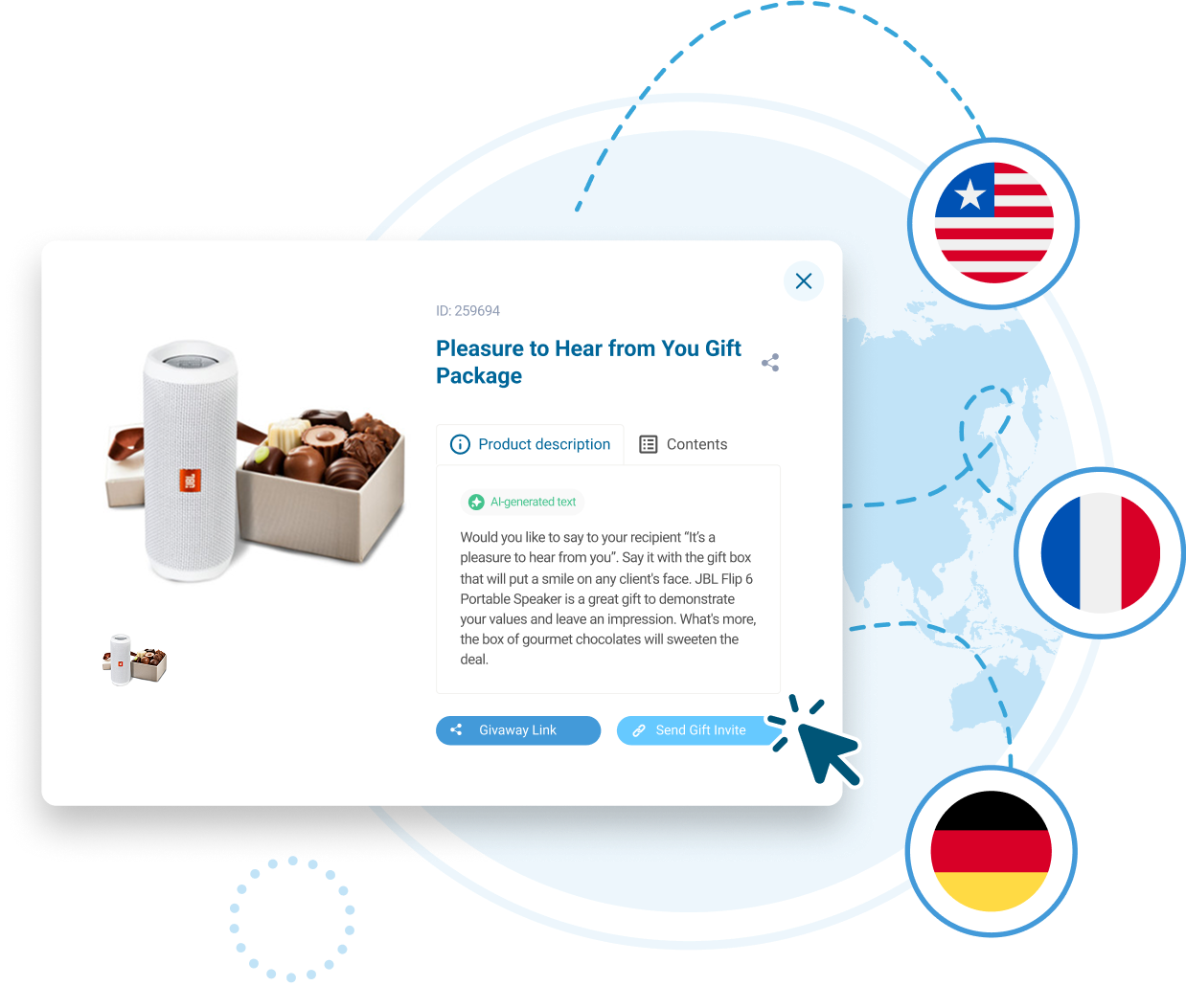 Integrate curated gift options from across the globe into your own mobile app, website, or platform. With coverage across major markets and localized options, you can offer your users a gifting experience that feels personal and relevant, no matter where they are.