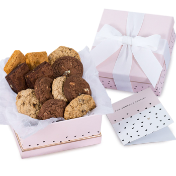 In this amazing gift you can find the following: Chocolate Chunk Brownie, Butterscotch Blondie, Peanut Butter Brownie, Chocolate Chip Blondie, Lemon Sugar Cookies (2), Fudge Brownie Cookies (2), Chocolate Chip Cookies (2), Oatmeal Raisin Cookies (2), Kosher OU-D certified, Gift Wrapping, Greeting Card. Please note: gift packaging and specific product brands may vary depending on the delivery location.