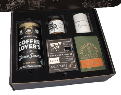 • Ridley’s Coffee Lover’s Jigsaw Puzzle • Frank Green 6oz Ceramic Thermos •Stumptown Hair Bender Blend Coffee •Copper Cow Pour Over Vietnamese Coffee •Broken Top Coffee Arabica Candle •Goodio Ubuntu Coffee Chocolate • gift note