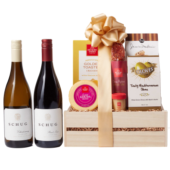 The Tasting Panel is a publication about various wines and wineries from around the world that rates wines based on a multitude of variables. We've gathered two of their highest-rated wines, and put them together to make a truly stunning gift. Your recipient will receive a bottle of Schug Sonoma Coast Pinot Noir, and a bottle of Schug Sonoma Coast Chardonnay, both rated 90 points by The Tasting Panel. Also included is a wide variety of snacks that go well with these wines, including Smoked Gouda, Toasted Crackers, Olives, and much more. Decadent Duo is the perfect gift for an anniversary, a wedding, or to impress your in-laws.