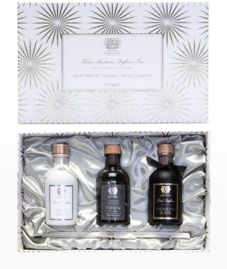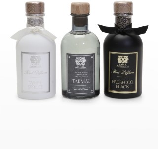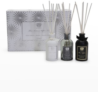 This Home Diffuser Set featuring three reed diffusers: fresh and sparkling Prosecco Black, green and earthy Tarmac, and classic evergreen, White Spruce. Give the gift of three indulgent, sophisticated scents in the festive velvet box.