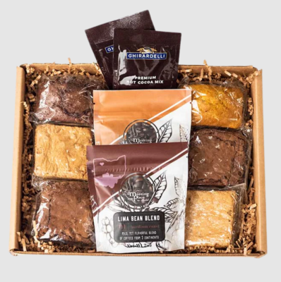 Introducing The Thank You Treats Collection, the perfect way to show appreciation to your hard-working employees or valued clients. This gift box is filled with an array of delectable treats, including two blondie brownies with white chocolate, two rich mocha brownies with fresh ground espresso, and two mini bread loaves. For a warm and comforting treat, the box also includes two Ghirardelli Hot Cocoa mixes and two coffee samplers each containing 1/8 lb of coffee. Each treat is crafted with care and will be sure to make anyone's day. Show your gratitude in a delicious and memorable way with The Thank You Treats Collection.